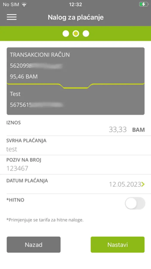 • Obavljanje transakcija između vlastitih računa ili uplate na karticu