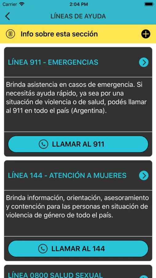 Te muestra las líneas telefónicas que brindan atención sobre derechos sexuales y reproductivos y violencia basada en género. Provee información sobre el tipo de asistencia que ofrecen, horarios de atención y vías alternativas de comunicación (por ejemplo, Whatsapp) si están disponibles. Concentra la información para que puedas hacer click y llamar a: la línea de Emergencias 911, la Línea 144 que brinda asistencia para las personas en situación de violencia de género, la Línea 0800 Salud Sexual que facilita el acceso a los servicios de salud sexual y reproductiva y las líneas de asesoramiento sobre salud en general. Estos canales de comunicación son administrados por el Estado.
