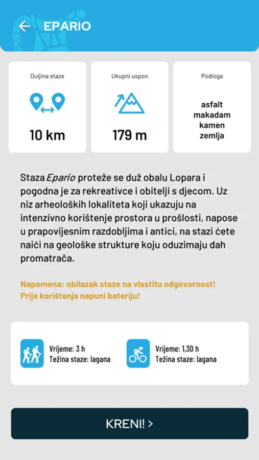 Rab Archaeological (T)races application guides you through pristine island landscapes showcasing valuable archaeological, sacral, and ethnographic heritage dating from the prehistoric era to the beginning of the 20th century. Archaeological sites have been presented along 33 info – points connected by 40 km of educational trails spanning across Kampor, Lopar, and Supetarska Draga, some of which along protected landscape areas. Certain sites lie hidden layers beneath your feet, whereas others stand tall in structures that have sturdily been defying the tooth of time for centuries. Besides navigating you through the trails and providing information on the sites, the application reveals numerous interesting facts and legends surrounding the island and its life through time. Characters brought to life in the virtual world and their tales from long ago, audio guides, extended reality, educational games and quizzes will make your exploration of the island an unforgettable adventure. The application is available offline to serve all nature and culture aficionados, on foot or by bikes. Which trail you should take is entirely up to you! Special rewards await the most successful at the end of their path.