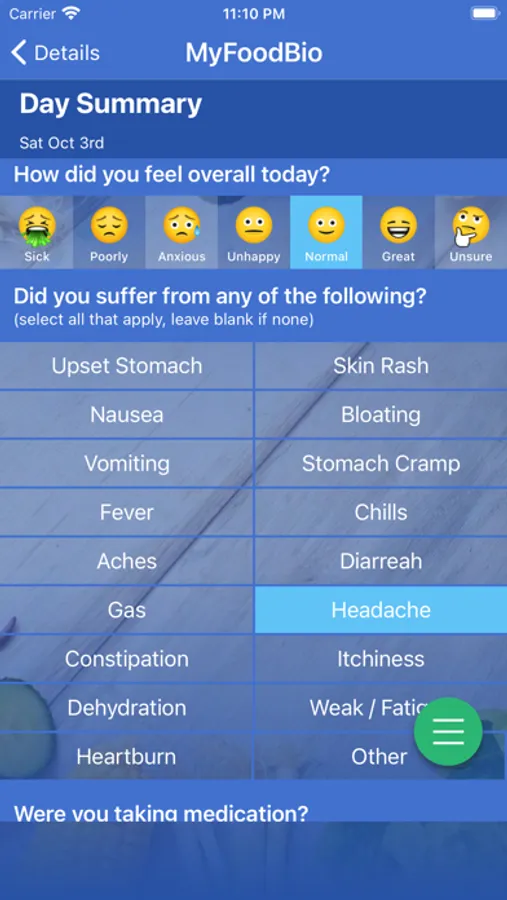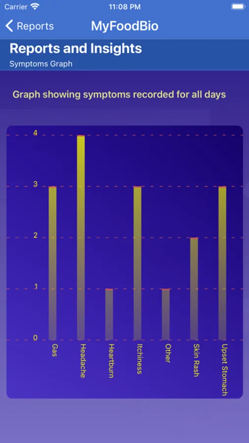 MyFoodBio is a food diary app which allows you to track what you eat and drink for each day, and log any physical symptoms you may have had.