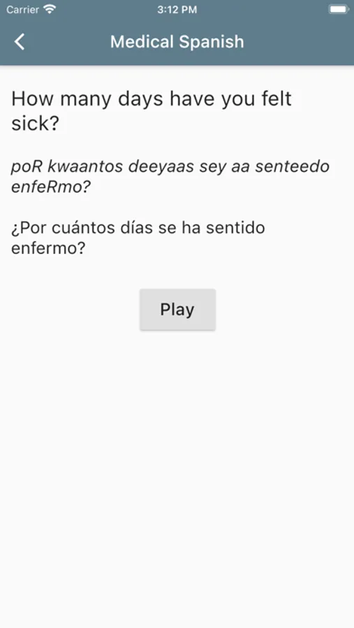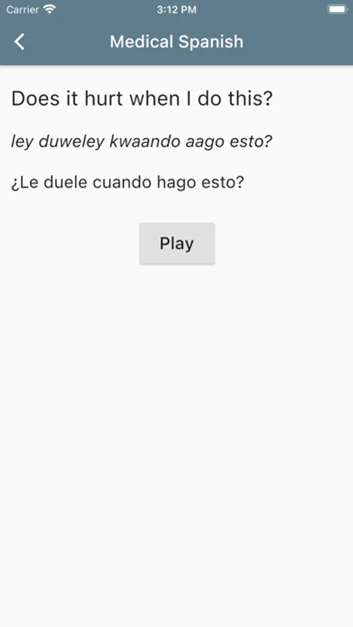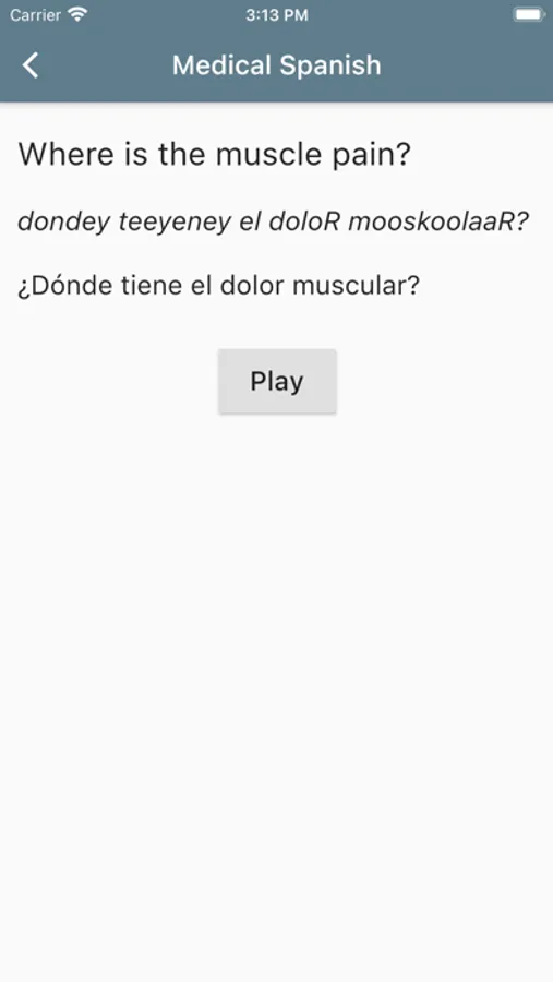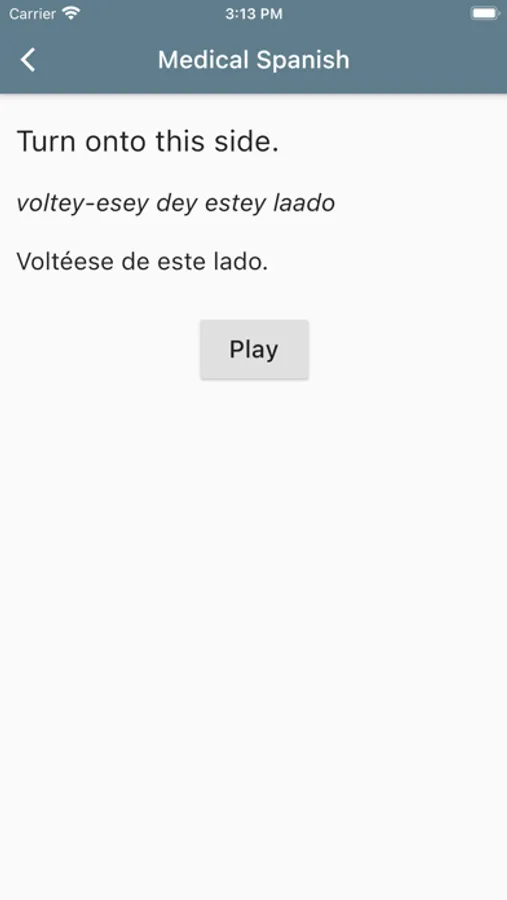 3. On the phrase detail page, the phrase itself is shown alongside its pronunciation and the equivalent English phrase. Press the Play button to hear the audio pronunciation by a native speaker.