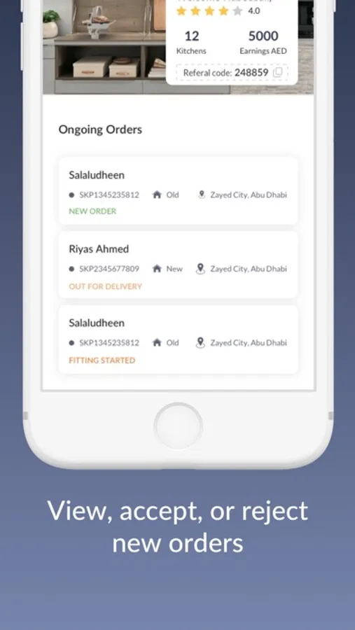 The dashboard allows you to keep track of all your past and incoming orders in one place. Accept/Reject the orders based on your convenience.