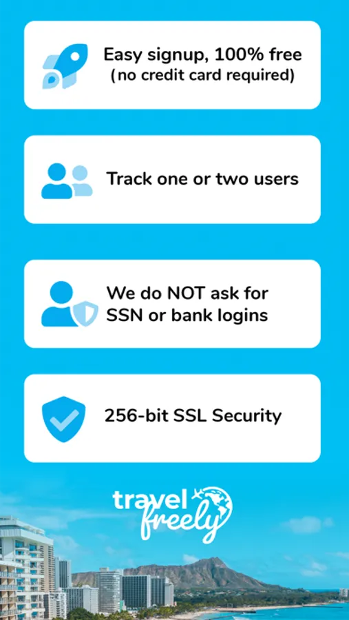 Our users say we have "the best travel app for earning points and miles and using a tracker for rewards credit cards." Rewards credit card tracker and points and miles earning is easy and simple. Travel Freely app can track your rewards credit cards, points and miles earned, and organize your cards for max rewards.