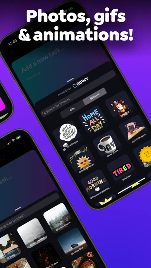 Use colors, stickers emojis, photos, patterns, gifs & animations to design, and share your tasks and lists.