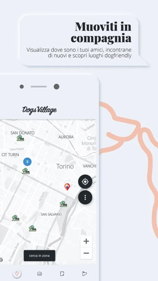 Tramite la mappa sará possibile manifestare la presenza del proprio cane in un determinato luogo; salutare gli amici e evidenziare la propria posizione all'interno di luoghi di interesse per i cani.