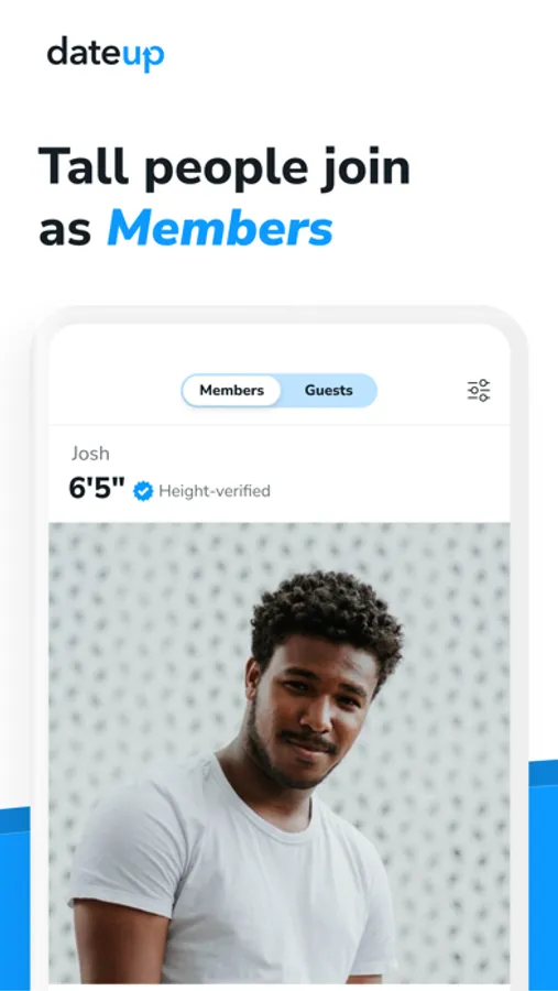 DateUp offers a safe place for tall people to find height-compatible matches with other tall people nearby, or with shorter people that want to date-up. DateUp is intentionally designed to create a balance between an exclusive and inclusive experience.