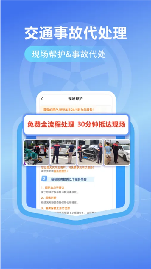 替替车主是以处理交通事故和智慧养车为核心的车主服务综合生态,以“人”为本,始终围绕解决车主根本痛点的立场,利用雾计算法则,为中国车主提供各场景下,24小时随呼随到,全天候专业服务。替替车主是中国交通事故处理专家,是中国车主无忧用车智慧平台,是中国车主权益的坚定守护者。