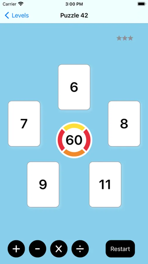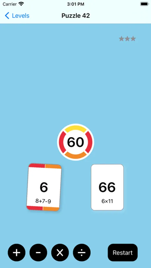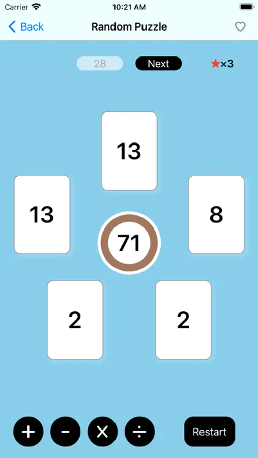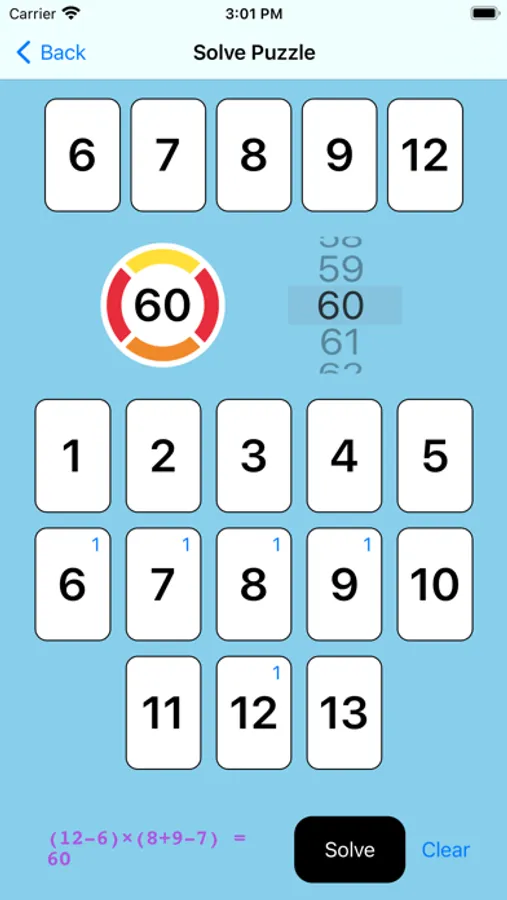 In the "24 Game", players manipulate 4 playing cards to achieve a result of 24 by using addition, subtraction, multiplication and division. In Numbertopia, players have to manipulate 4 or 5 cards to achieve a random number. It requires more complicated strategies and advanced arithmetic skills.