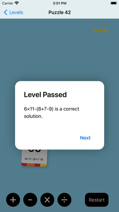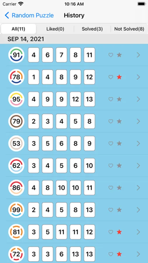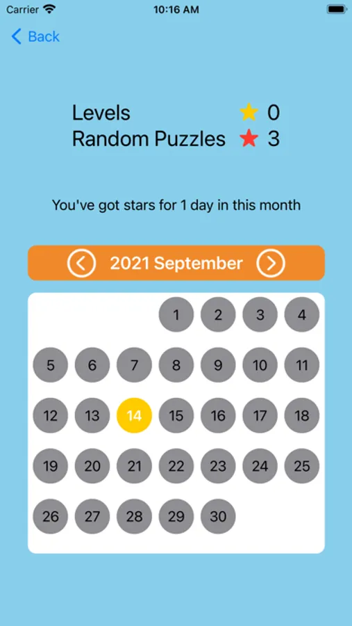 There are 2 kinds of puzzles in Numbertopia: the Level Puzzles and the Random Puzzles. The Level Puzzles contain 100 stored puzzles. At the start, most levels are locked, and players solve the puzzle from level 1 to gain yellow stars. By gaining more yellow stars, more levels can be unlocked. The Random Puzzles are generated by computer at real time. There can be more than one solutions for each puzzle, and players will gain a red star if find any solution without viewing the answer.