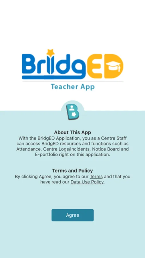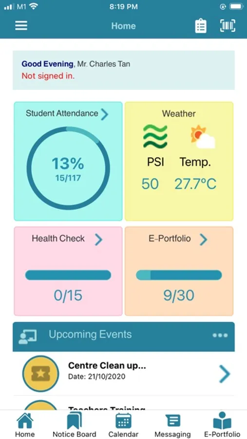 Functions for teachers to take attendance, apply for leave, enter centre logs, upload files and receive announcements.