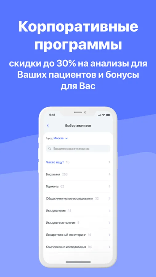 К вашим услугам корпоративные программы крупнейших сетевых лабораторий. Только по вашему приглашению пациенты получают дополнительные 10 000 бонусов (1 бонус = 1 рубль) и могут оплачивать ими до 30% стоимости анализов, а вы получите значительный бонус за помощь в оформлении заказов.