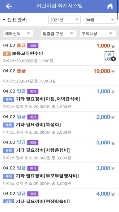 서울 관내 어린이집의 관리시스템 웹 화면과 연동되어 모바일에서 손쉽고 편리하게 회계 업무를 수행하도록 구현한 어플입니다.