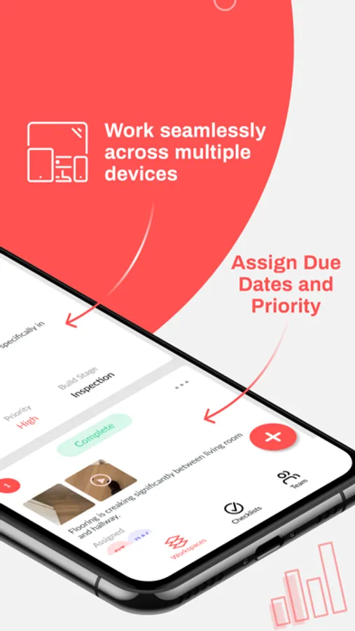 On-site or off-site: manage defects, snag lists, punch lists, checklists, surveys and project workflow in full synchronisation and with unlimited collaboration. Track your progress collaboratively within the app or export as a PDF or Excel document.