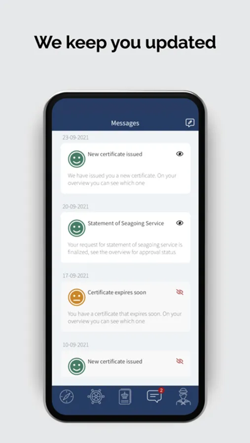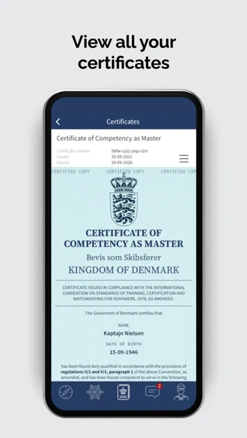 You can view and share all your certificates with the shipping company, for You to securely provide them access to an automatically updated overview, saving you the trouble of sending copies by mail. Sharing can be time limited and stopped at any time.