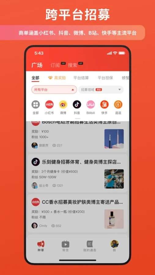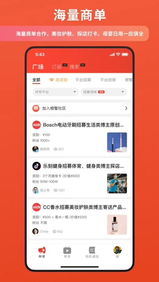 螃蟹通告拥有50W+活跃博主,5W+优质商家,涵盖品类广泛,用户活跃度高,奖励丰厚。平台现已支持小红书、B站、抖音、快手、微博等平台,博主们快来报名合作吧。