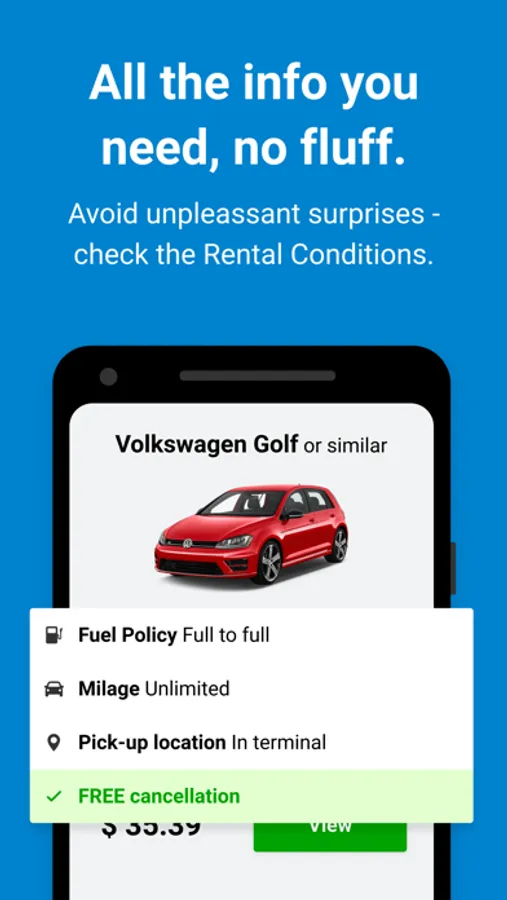 Find all the information about each rental car conveniently in one place — from the fuel and mileage policy to what coverage is included. Don’t forget to check the Rental Conditions before booking to avoid any surprises later on!