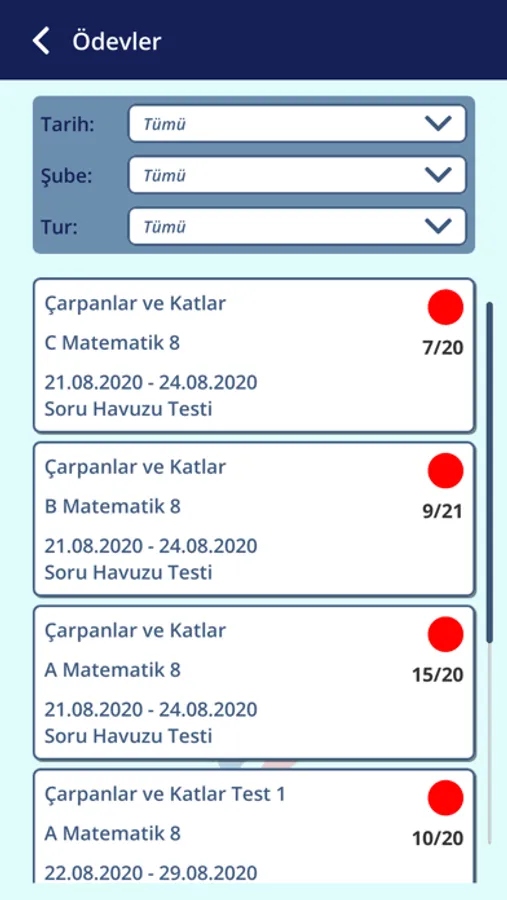 Şube ve ders bazlı öğrencilerin Ödev, İçerik, Konu anlatımı durumlarını raporlayabilirsiniz.