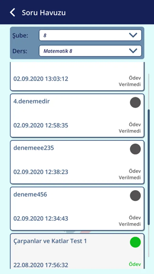 Milli Eğitim Bakanlığı Talim Terbiye Kurulu tarafından belirlenen konu ve kazanımlarla eşleştirilmiş binlerce sorudan test oluşturabilir bu testleri ödev olarak verebilirsiniz. Testlerin Pdf çıktılarını alabilirsiniz. Öğrencilerin ödev durumlarını kontrol edebilir doğru yanlış sayılarına bakabilirsiniz.