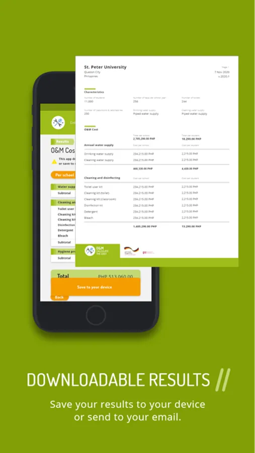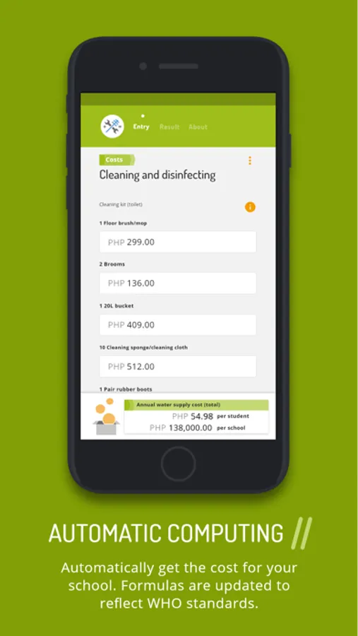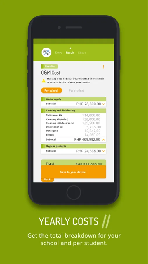 This tool supports you in calculating the Operation and Maintenance (O&M) costs for water, sanitation and hygiene in school activities. The app also calculates the costs for proper cleaning and disinfection in accordance to WHO recommendations. Enter your data and see how much you spend on O&M now. In addition, the app can estimate how much to improve your schools WASH services. You can see the result immediately. You can also request to have the results sent to you via email and use them for your school’s budgeting.