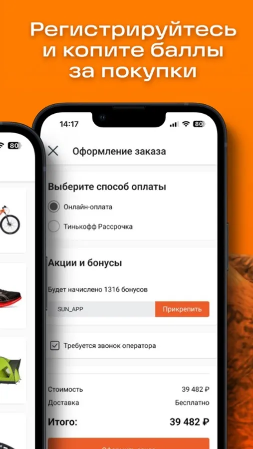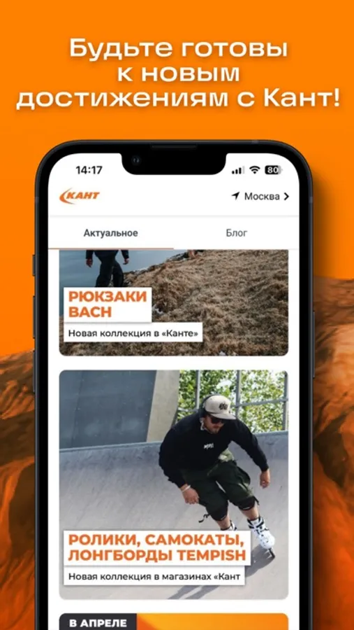 Мы постоянно обновляем ассортимент и сохраняем выгодные цены. Скачивайте приложение "Кант", подбирайте спортивные костюмы и обувь для бега, рюкзаки, палатки для активного отдыха на природе, аксессуары для плавания и фитнеса, велосипеды, кроссовки, ролики, самокаты, скейтборды получайте скидки и накапливайте БОНУСЫ!