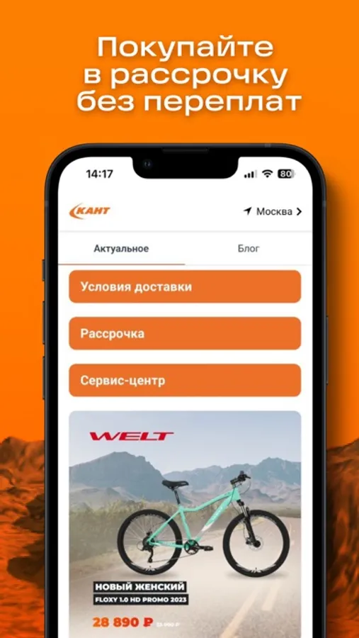 В магазине "Кант" вы можете легко купить велосипед мечты в рассрочку. Первоначальный взнос 0 рублей! Все оформление происходит за 10 минут, поскольку рассмотрение кредита производится несколькими банками одновременно. А также, вы можете поделить стоимость покупки на 4 части. Выберете понравившийся из широкого ассортимента велосипедов, оплатите сегодня только 25% стоимости и покупка уже ваша!