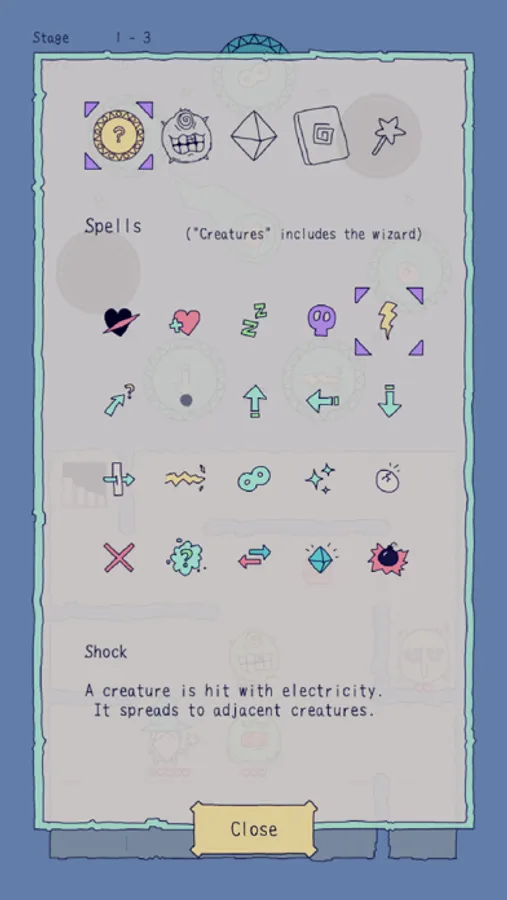 There are various spells, such as Hurt, Heal, Put to Sleep, Poison, Shock (with electricity), and many others. Spells can be used on monsters, but also on yourself if you so wish! Some other spells include Clone (play with multiple wizards!), Explode, Convert (get monsters on your side!), polymorph, and so on.