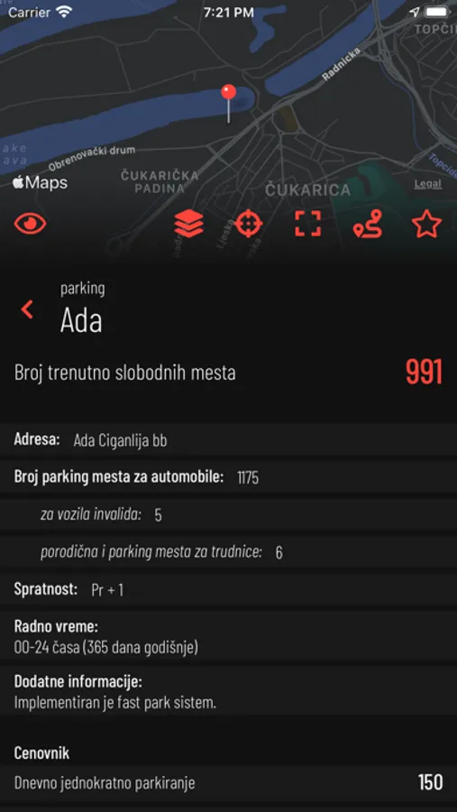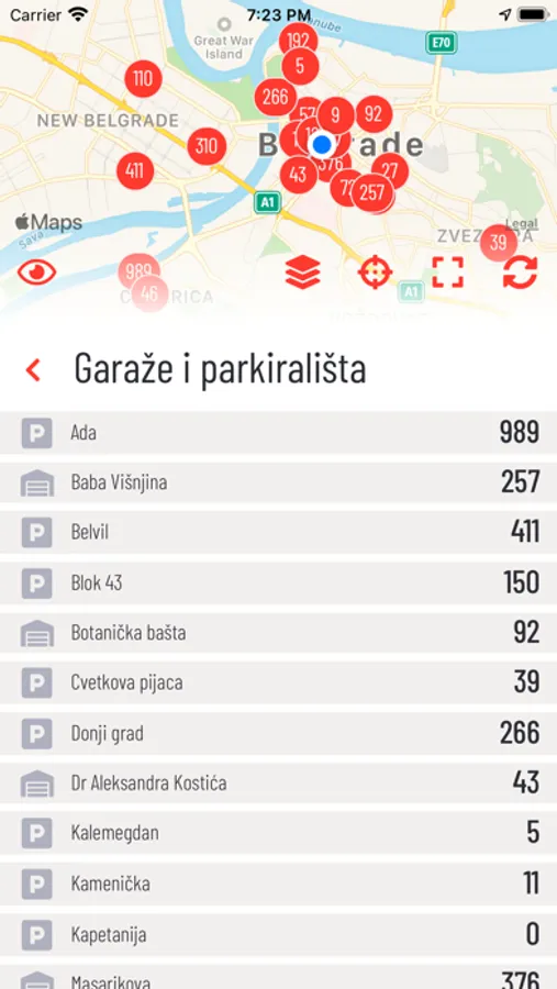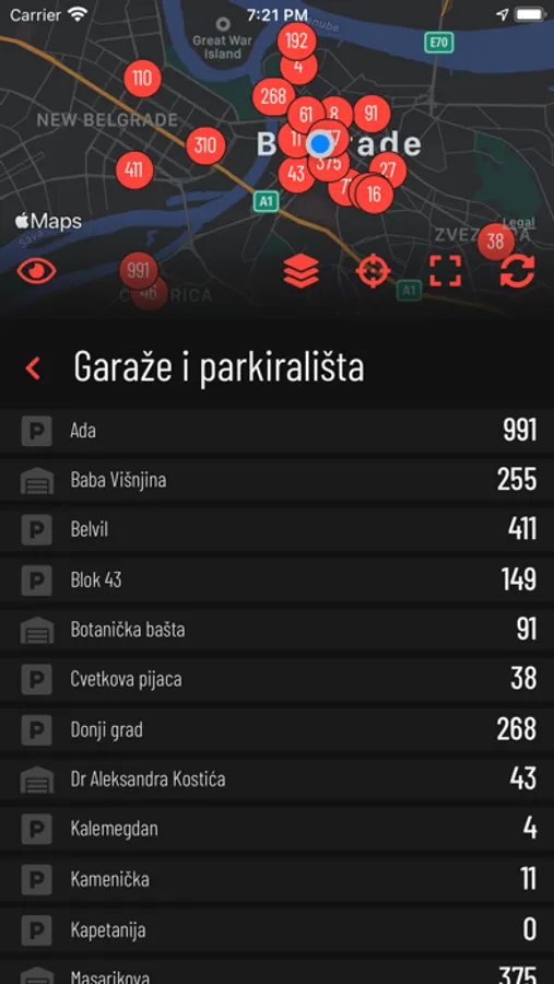 - spisak trenutno slobodnih parking mesta u garažama i parkiralištima. Za svako mesto se prikazuje lokacija na mapi, cenovnik i dodatne informacije o kapacitetu. Moguće je označiti lokaciju kao omiljenu i kreirati rutu do te lokacije.