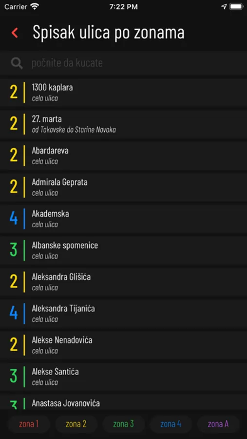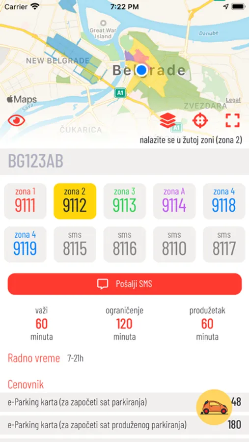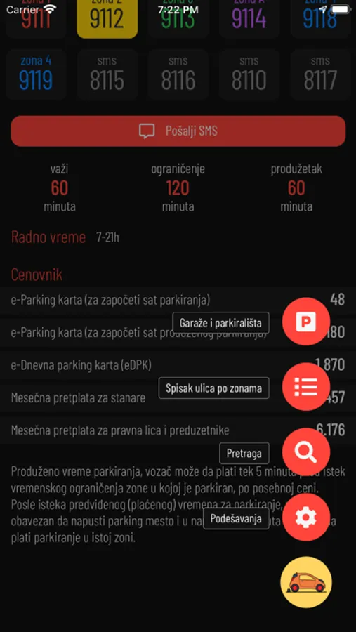 - spisak brojeva za zonu A, zonu 1 (crvena), zonu 2 (žuta), zonu 3 (zelena), zonu 4 (opšta parkirališta izvan zoniranog područja), sms parkiralište "Vidin kapija" i sms parkiralište "Sava promenada". Za svaki broj se prikazuje cenovnik i informacije o vremenskim ograničenjima.