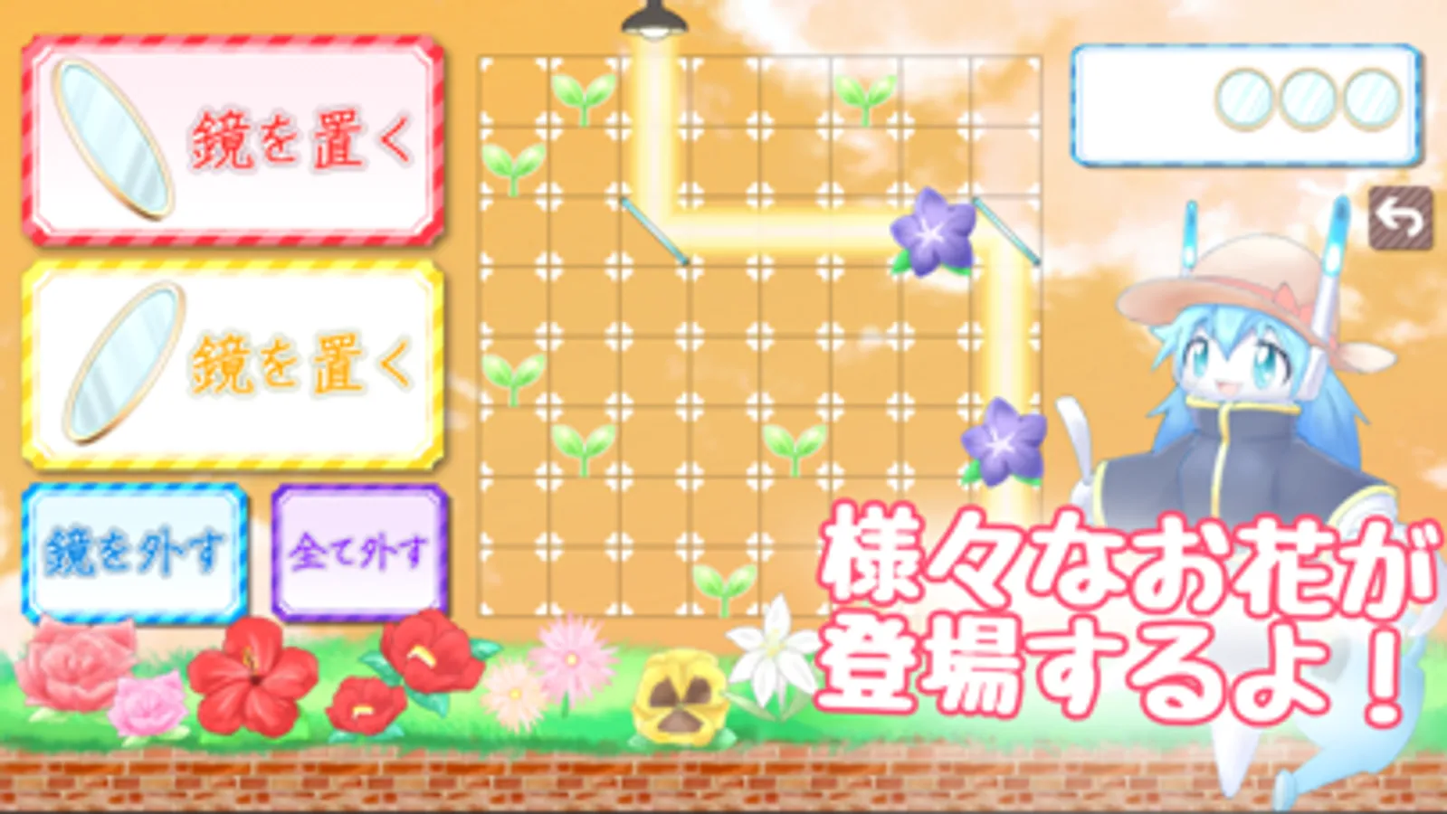 操作は簡単、鏡を置きたいマスをタップするだけ!うまく光を反射させて、芽に当てると花が咲くよ!