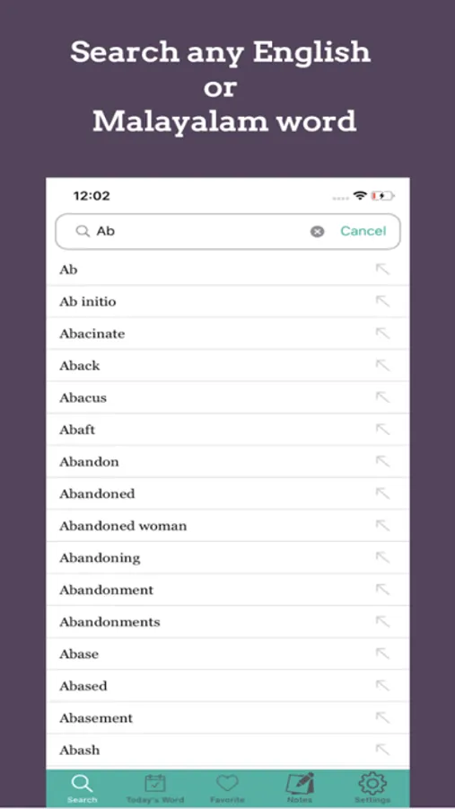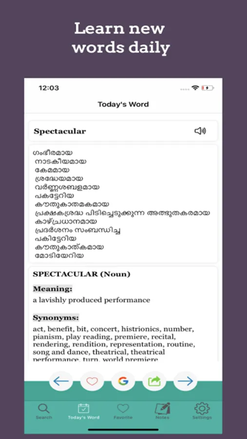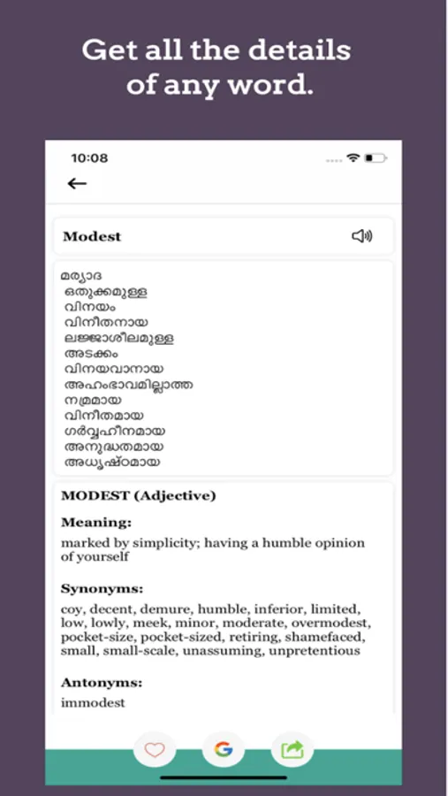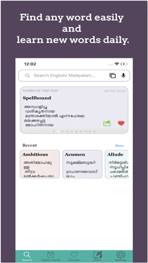Offline, easy to use English to Malayalam Dictionary or Malayalam to English Dictionary App. This app helps to easily get the Malayalam meaning of the English word by autosuggestion or by voice search to look up words. This app helps to save your words to Favorite and also help to find your searched words from History list. App helps to increase your vocabulary by showing a new word daily by notification.