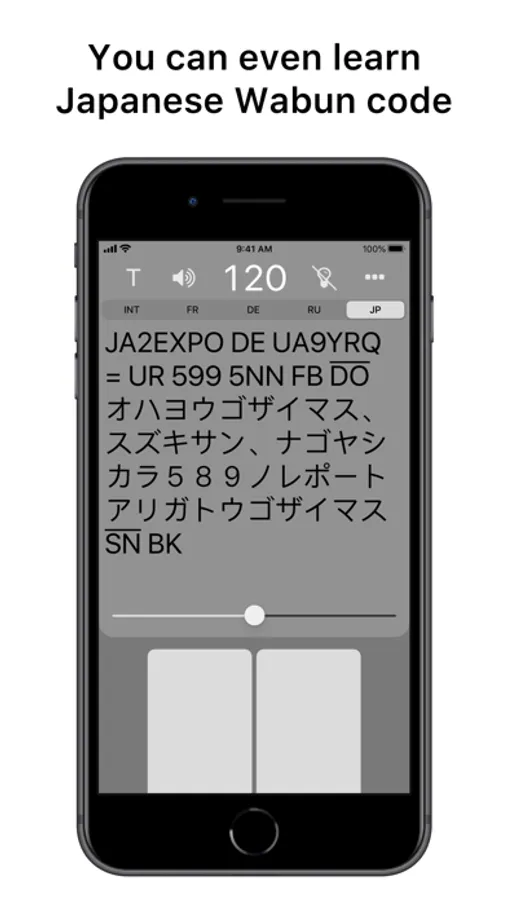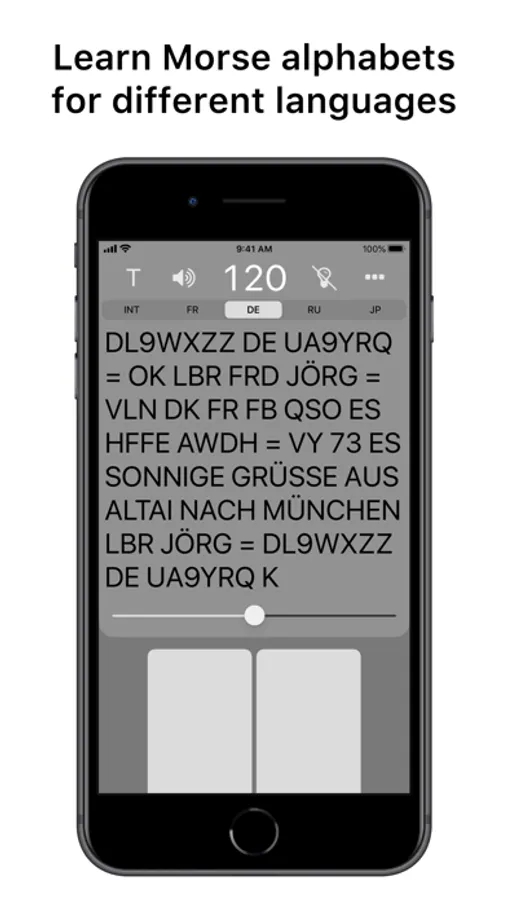 When displaying the transmitted text, the app "knows" in addition to International Morse code a number of extensions for different languages. Supported alphabets include Japanese (Wabun code), Greek, Cyrillic-based and Latin-based alphabets with diacritical marks.
