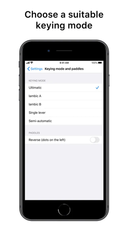 The app operates like a real electronic keyer with a dual-lever paddle, dot and dash memories and various keying modes including "iambic". It produces a series of short sound signals (dots) when one of the paddles is pressed and a series of long signals (dashes) when the other one is pressed.