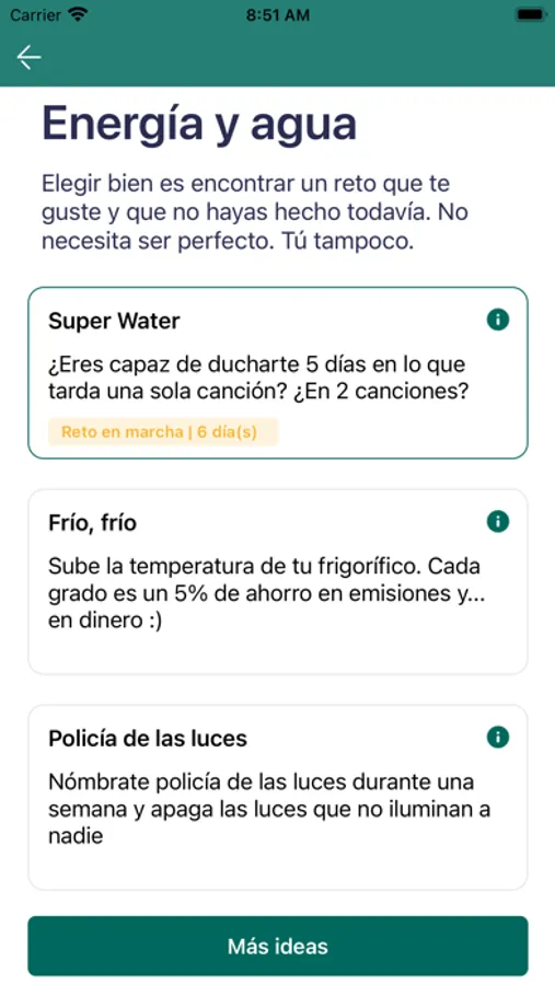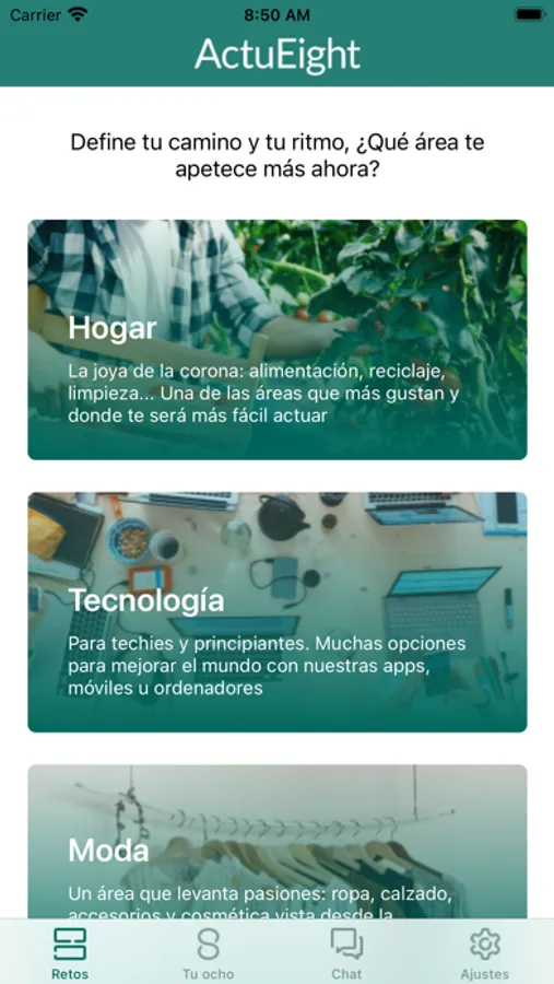 Podrás elegir entre +70 acciones distribuidas en 6 áreas: Hogar, Tecnología, Moda, Finanzas, Transporte y Energía /agua. Elegirás retos según tu gusto y tu momento actual. Así que olvídate de la vergüenza o la culpa. Todos los retos valen igual porque cada persona escogerá aquellos que le supongan un paso adelante, que sean alcanzables y que no les martirice. Y, por supuesto, los unirás con aquellas causas que más os importan a cada persona.