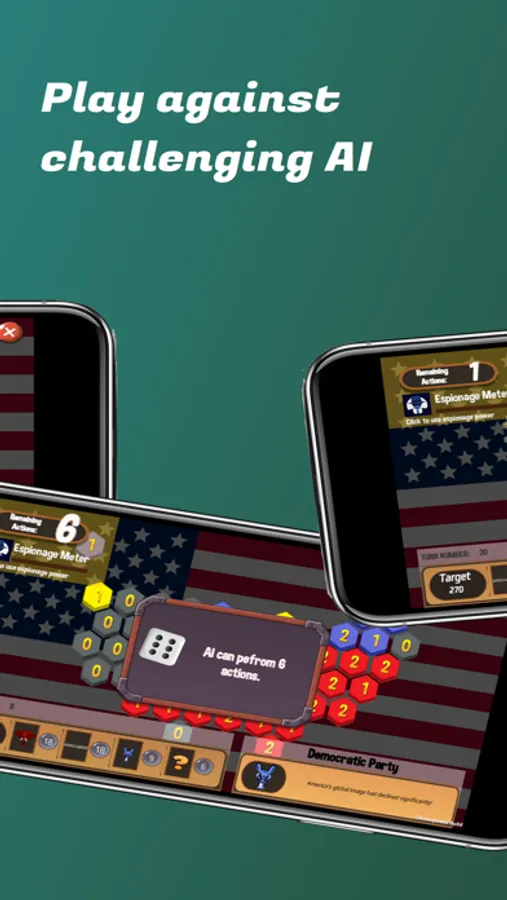 User need to throw dice then user gets as many actions as dice shows. User can use only these number of actions in that particular turn. Actions could be capture empty territory, Increase power of own territory, reduce power of enemy territory or Increase espionage meter.