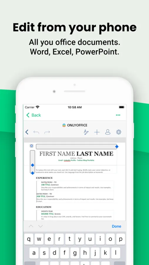 We understand that most of our users are professionals who need to be able to access and edit their data on the go. That’s why we built our office suit to be 200% compatible with Microsoft Office. That means you can read and edit Office directly from the app.