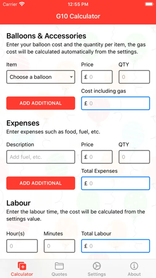 Helium and Air fill options are available when estimating, along with specifying any additional accessories, labour or any other costs.