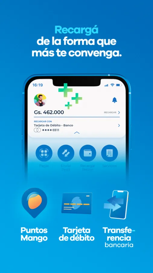 • Recargá tu cuenta con efectivo en los Puntos Mango, desde la aplicación con tu tarjeta de débito, o a través de transferencia bancaria