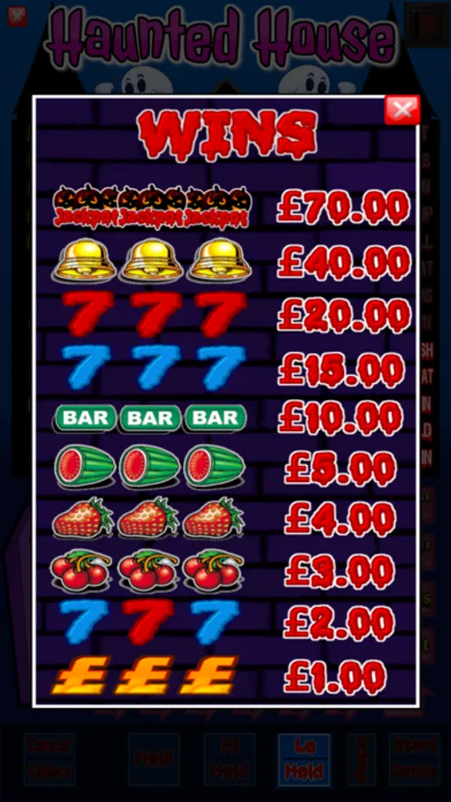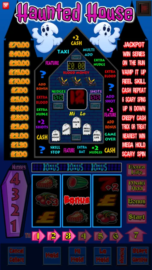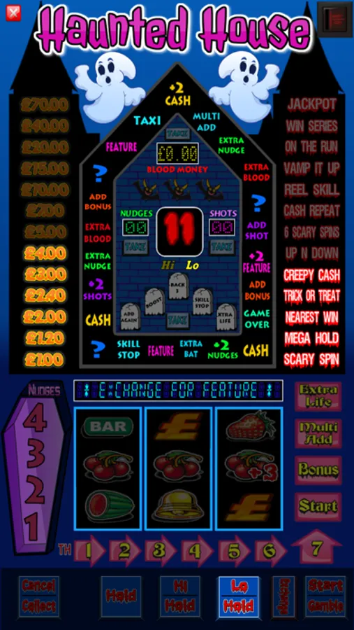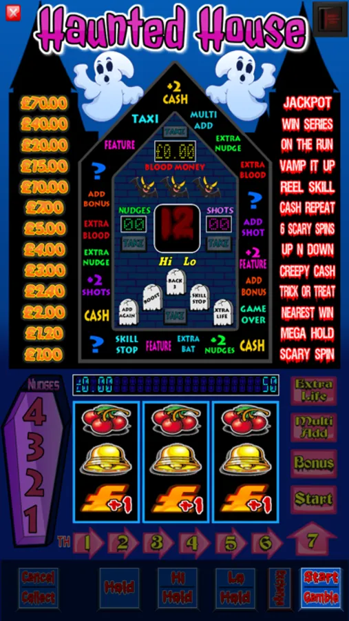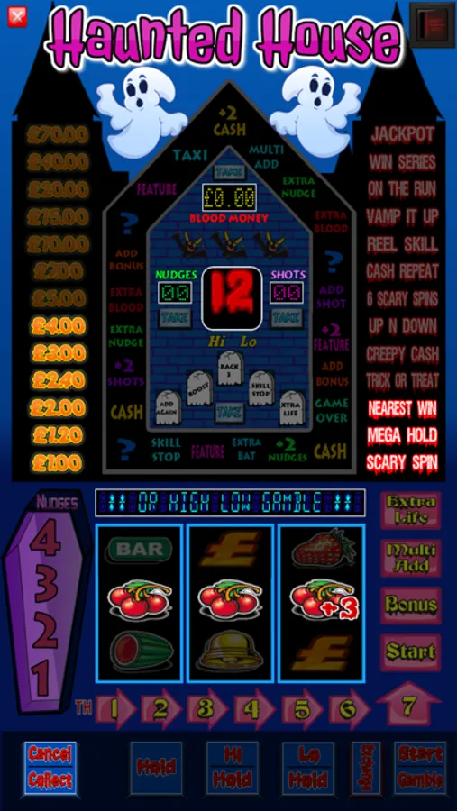 Haunted House fruit machine is spooky UK style fruit machine game, featuring halloween themed graphics and lots of haunting sound effects and music.