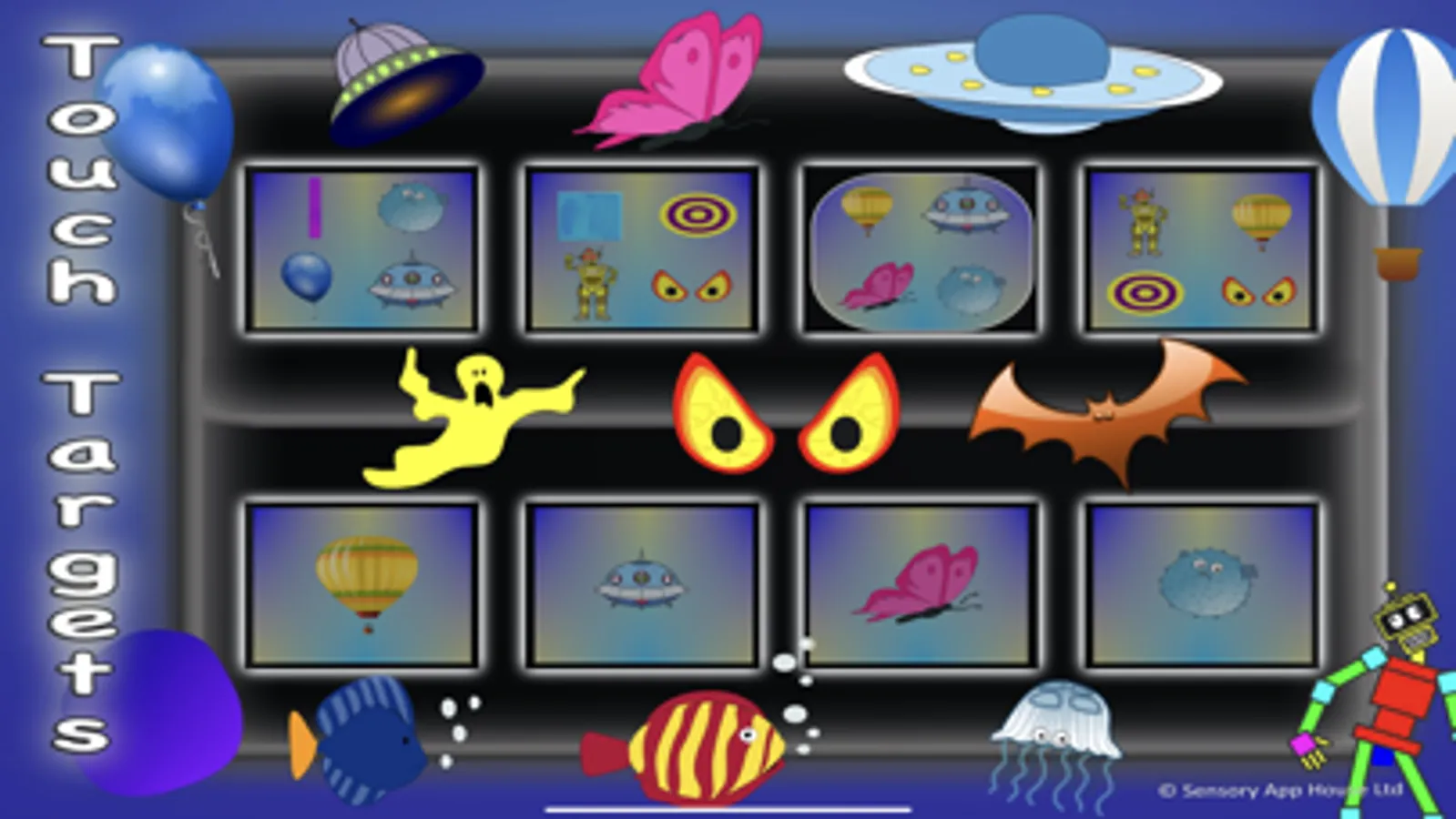 Touch Targets is an early learning fun activity app. It may help develop coordination and stimulation for young learners. Touch Targets contains different fun animated shapes and characters that appear in random places on screen. When the target is touched by a tap, then character jumps somewhere else. New characters appear automatically and there is plenty of applause. Sea creatures, space alien and rockets, butterflies and balloons, halloween characters as well as simple shapes and mesmeric blobs will keep the young ones exploring.