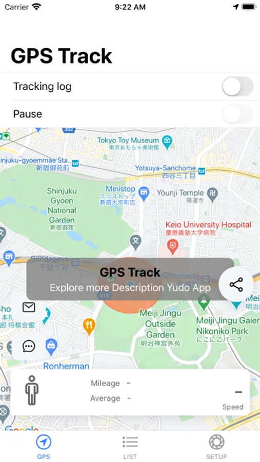 GPS Location Track Yd Navi & GPX es completamente gratuito y puede registrar la información de su viaje cuando vaya a un lugar de la ciudad o en un viaje. Puede importar el archivo GPX generado por este rastreador de ubicación Yudo a su computadora y mostrarlo en Google Maps. Además, GPX generado por el rastreador de ubicación Yudo se puede compartir con otros usuarios utilizando la función de compartir de los teléfonos inteligentes.