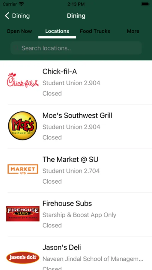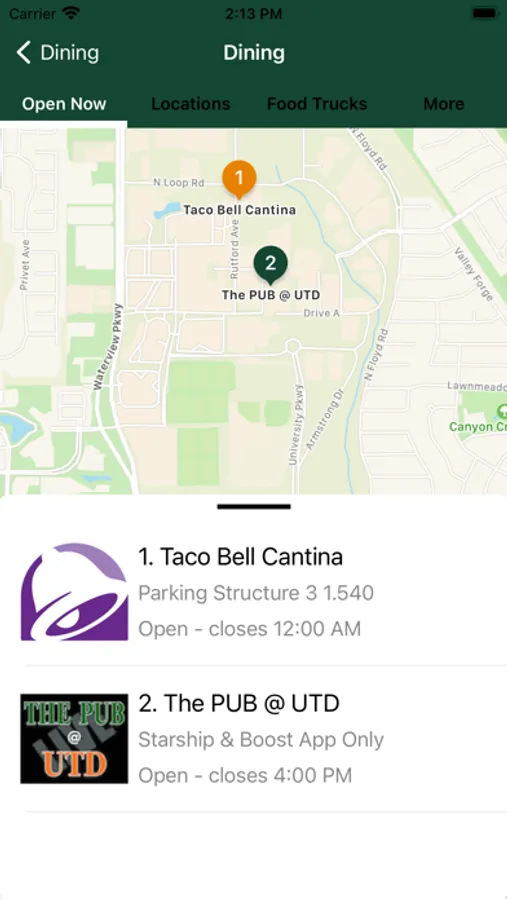 Dining —Show open restaurants and food trucks, order food online, find vending services.