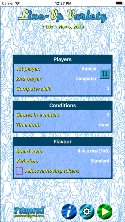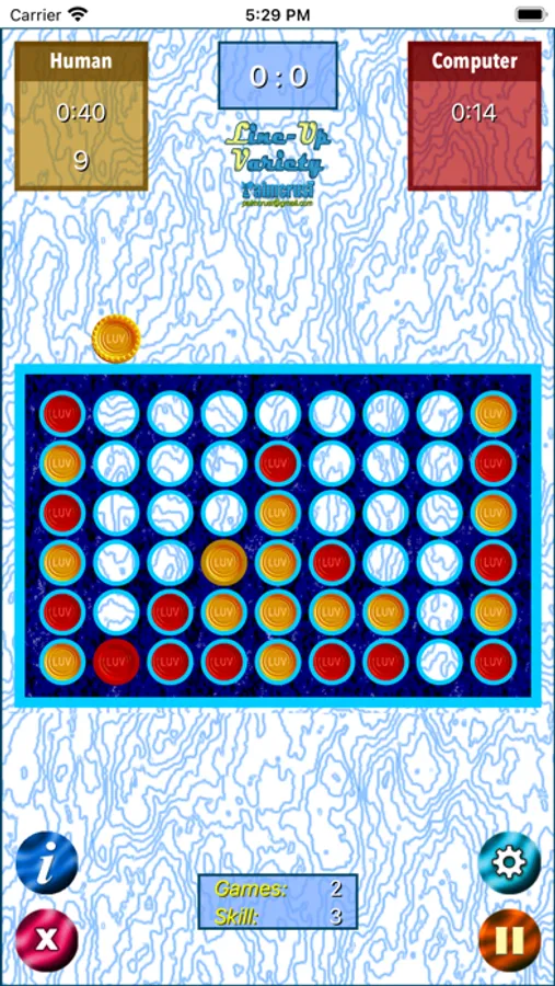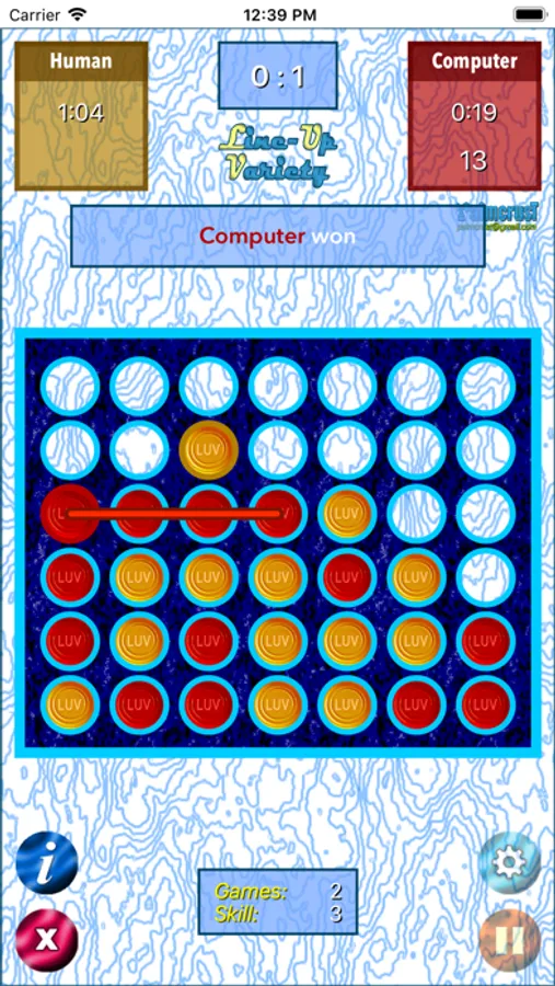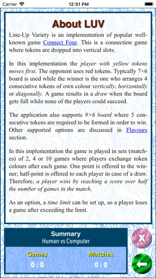 Line-Up Variety is an implementation of popular well-known game Connect Four. This is a connection game where tokens are dropped into vertical slots. Typically 7×6 board is used, while the winner is the one who arranges 4 consecutive tokens of own colour vertically, horizontally or diagonally. A game results in a draw when the board gets full while none of the players could succeed. The application also supports 9×6 board where 5 consecutive tokens are required to be formed in order to win.