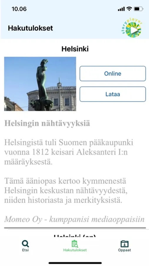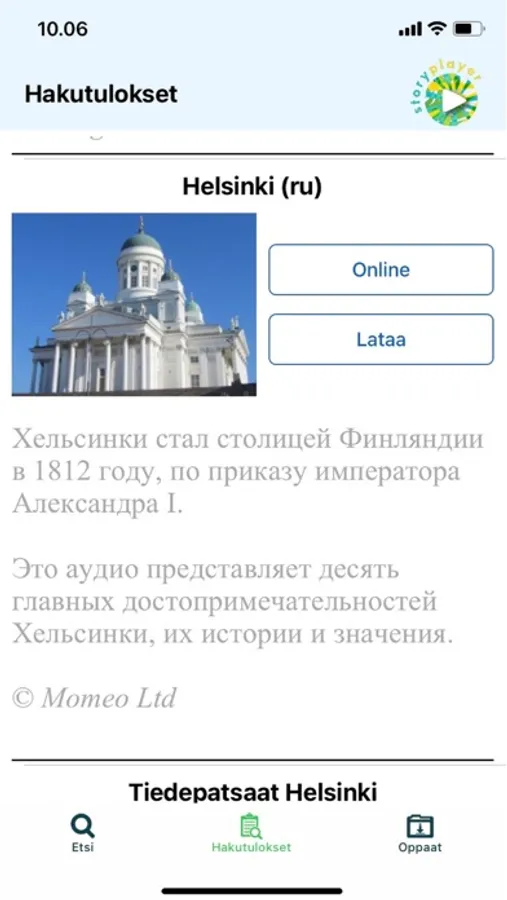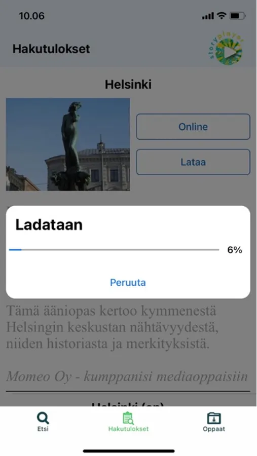 With the StoryPlayer application, you can use the mobile guides created with Momeo Oy's StoryMaker without a constant network connection. You can download and download the mobile guides you want in advance.