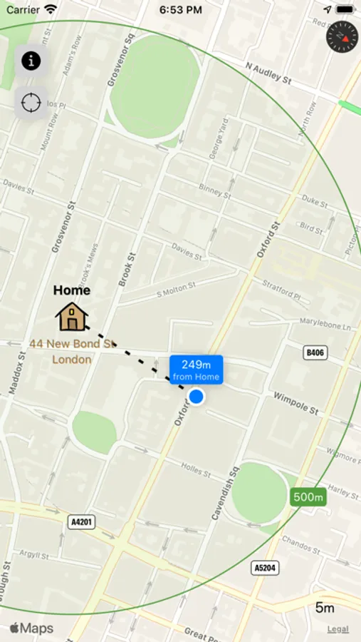 • Automatically moves and scales map for best presentation of home, your location and circle's perimeter