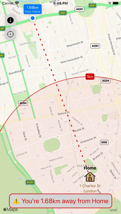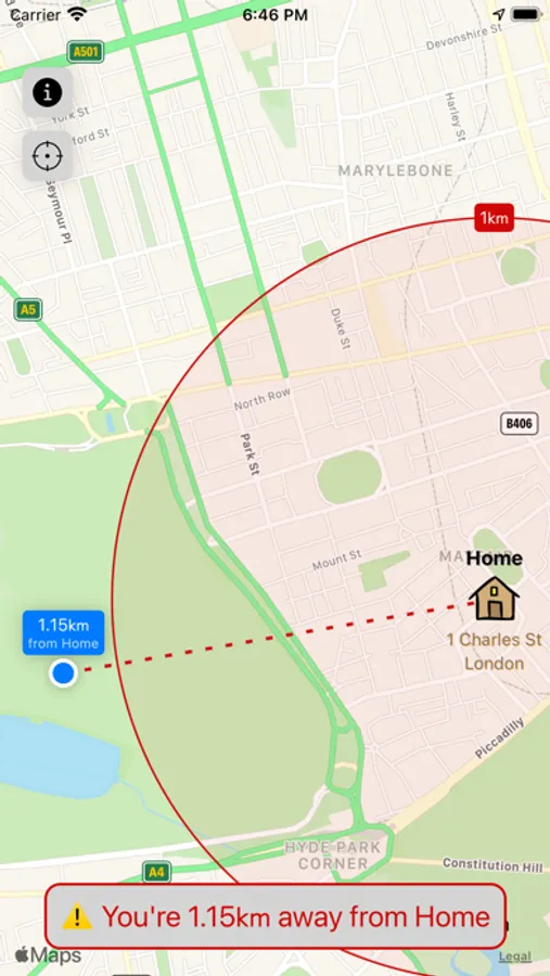 With this app you can easily show a radius circle around your home, and distances of your location (and other locations) from home.