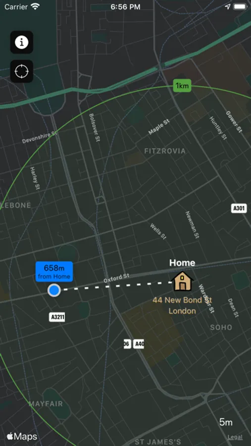 • Long-press anywhere on to drop a temporary pin, showing its estimated address and distance from home. Tap on pin to clear it
