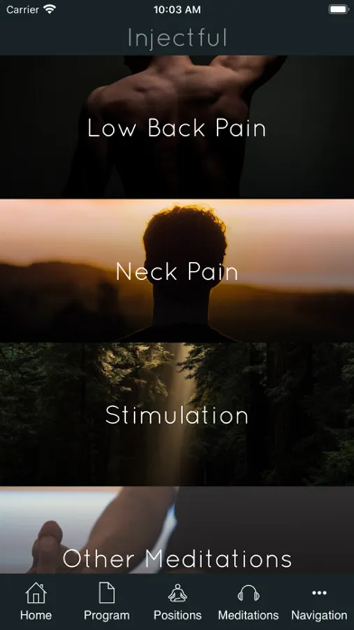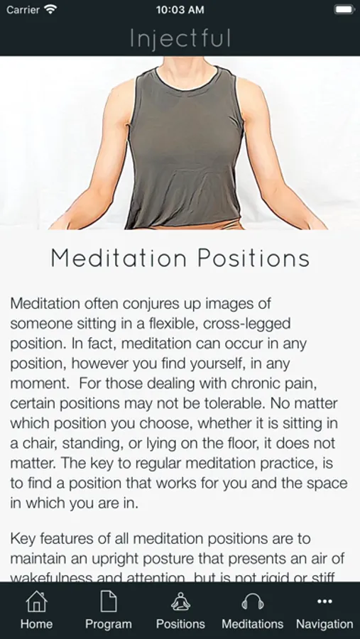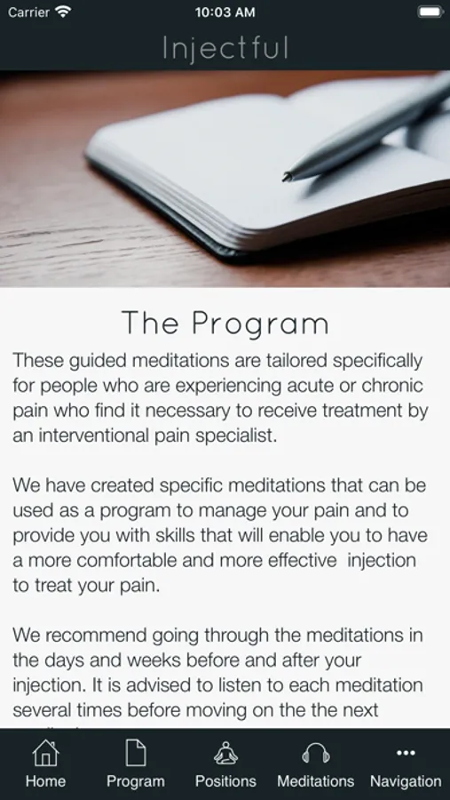 Injectful creates meditation programs for patients undergoing injections and interventional pain procedures by pain management specialists. The meditation programs were designed by pain physicians to provide dedicated mindfulness tools to assist you in the periods before, during and after your injection or procedure, to help you on your journey to pain relief.