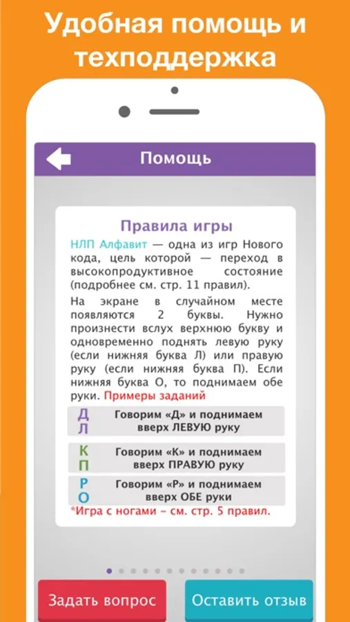 На экране в случайном месте появляются 2 буквы. Нужно произнести вслух верхнюю букву и одновременно поднять левую руку (если нижняя буква Л) или правую руку (если нижняя буква П). Если нижняя буква О, то поднимаем обе руки. Добавьте в игру ноги (в Настройках), чтобы сделать ее увлекательнее и в то же время сложнее!