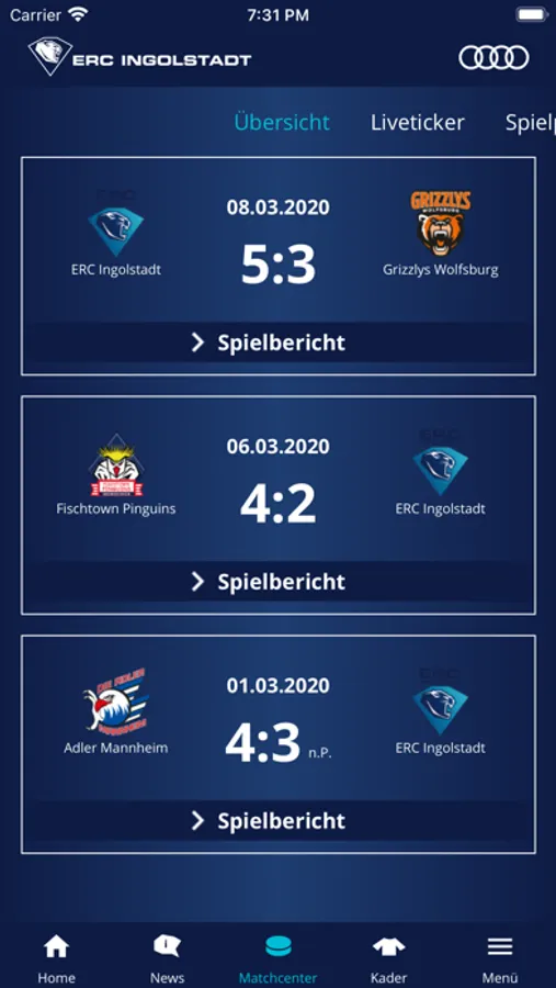 • Umfangreiches Matchcenter mit Liveticker inkl. Tore, Strafzeiten, Line-Up, sowie Spielplan und Tabelle.