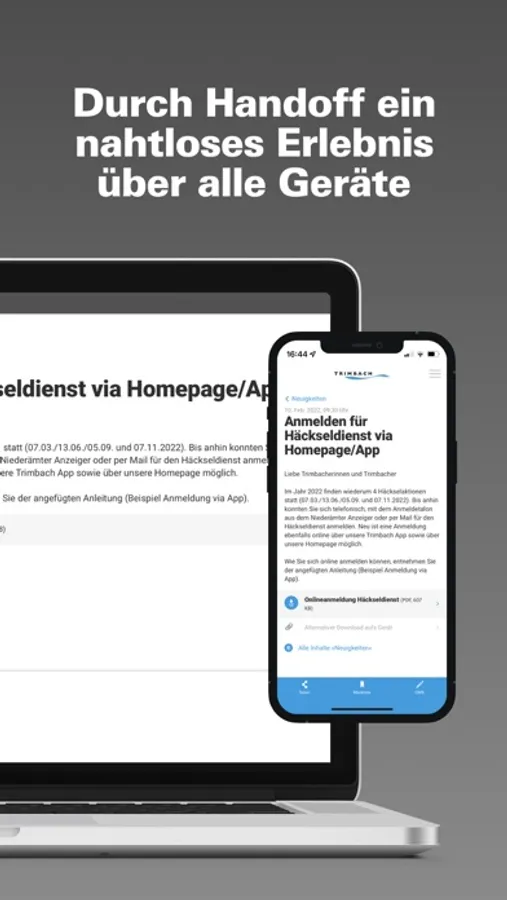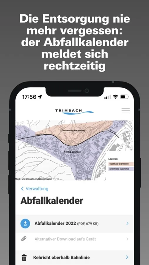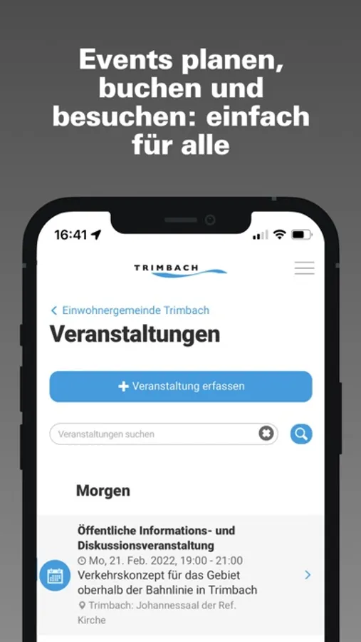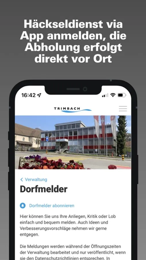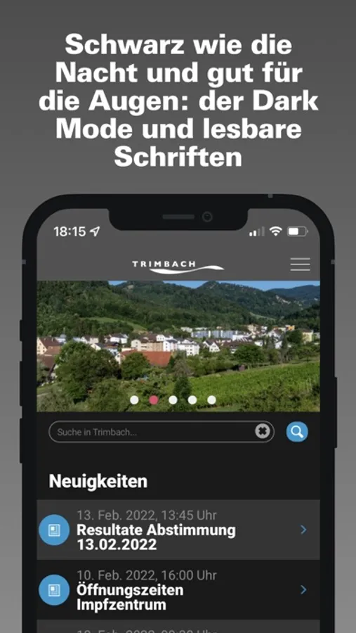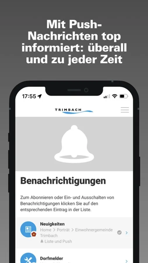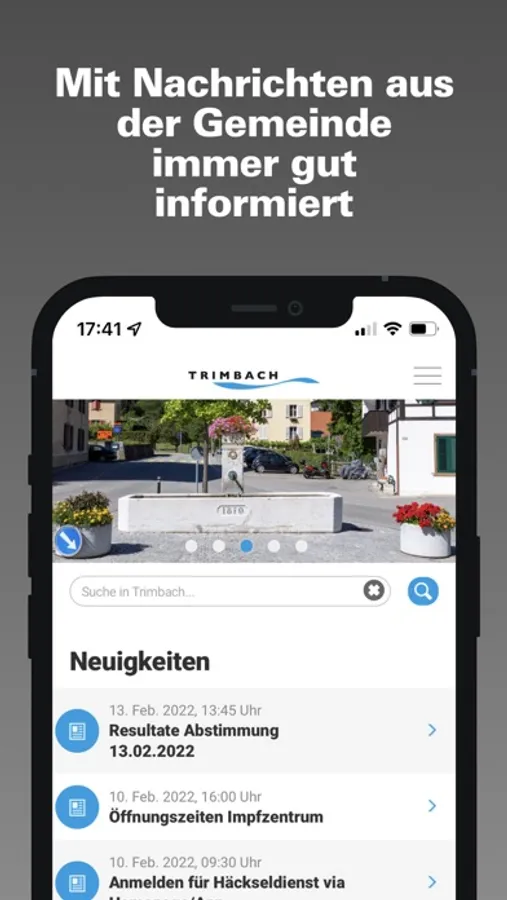 Die App der Einwohnergemeinde Trimbach umfasst Informationen aus Politik und Kultur. Die App der Einwohnergemeinde Trimbach bietet den Trimbacher Einwohnerinnen und Einwohnern eine zeitgemässe Informations- und Kommunikationsplattform. Mittels Push-Nachrichten werden sie über Neuigkeiten oder anstehende Veranstaltungen informiert. Einwohner können direkt über die App mit der Gemeinde in Kontakt treten oder sich untereinander vernetzen.